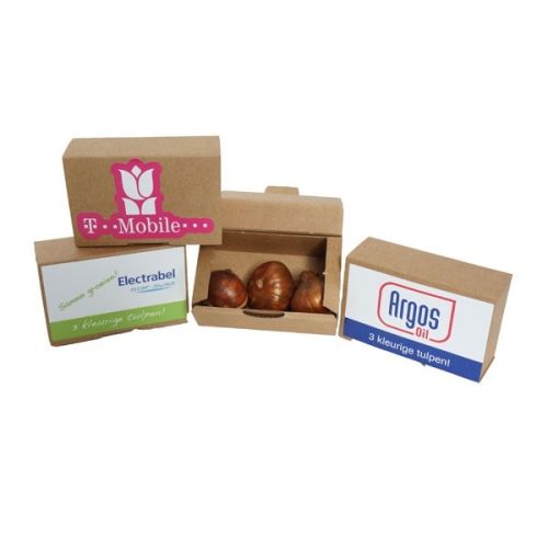Op het doosje met tulpenbollen zit een label die u zelf kunt ontwerpen en vervolgens fullcolour is te bedrukken. Van bloemen wordt iedereen vrolijk, waardoor uw relaties met positieve gevoelens aan uw bedrijf denken als de tulpen in bloei staan. De tulpenbollen zijn alleen leverbaar van augustus t/m december, dus wees er snel bij! Daarnaast leverbaar met gladiolen en anemoontjes.