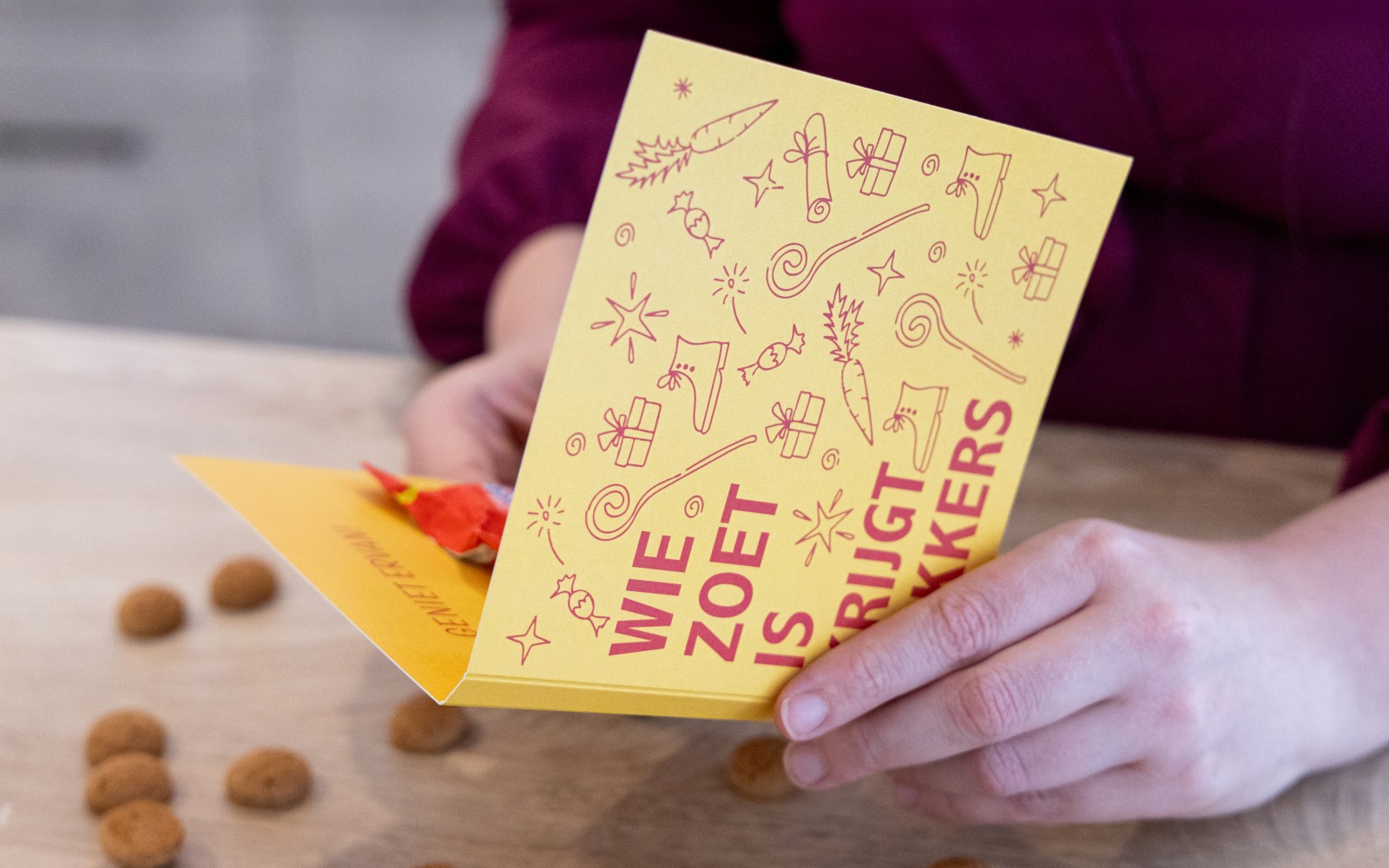 Ook leuk om te geven is deze gevouwen kaart met aan de binnenkant een Tiny Tony, een heerlijk fairtrade mini chocolaatje. Net even wat extra's voor uw medewerkers, relaties of klanten. De kaart heeft een vierkant formaat en kunt u volledig full colour laten bedrukken met een mooi Sinterklaas ontwerp.