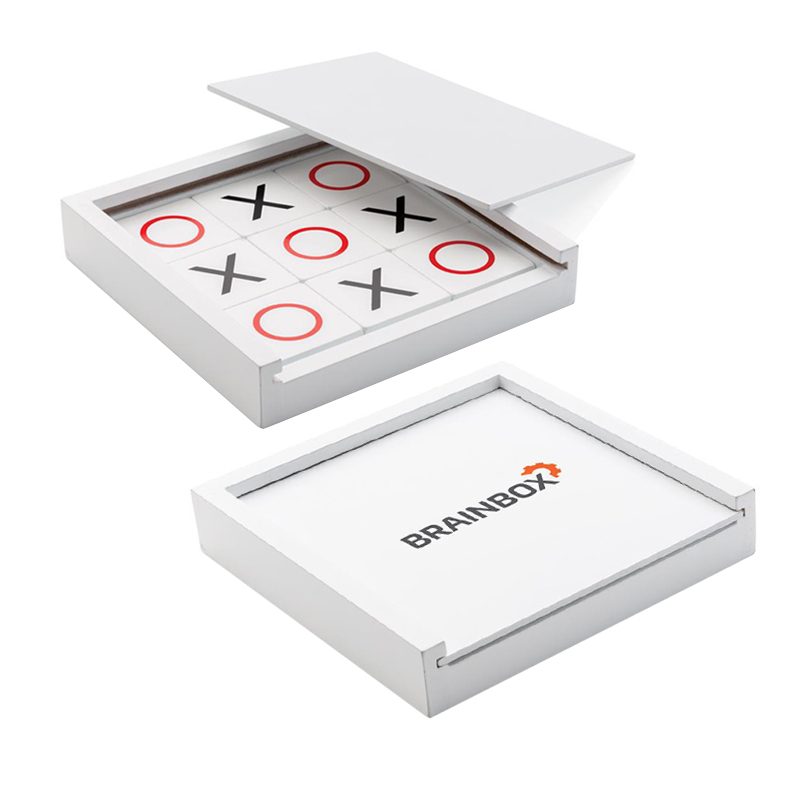 Een bekende klassieker: het boter-kaas-en-eieren spel. Deze versie is gemaakt van FSC-gecertificeerd hout. De speelstenen zitten in een witte houten doos, die dankzij het compacte formaat makkelijk overal mee naartoe genomen kan worden. De doos kan op de bovenkant gegraveerd worden met uw logo of tekst.