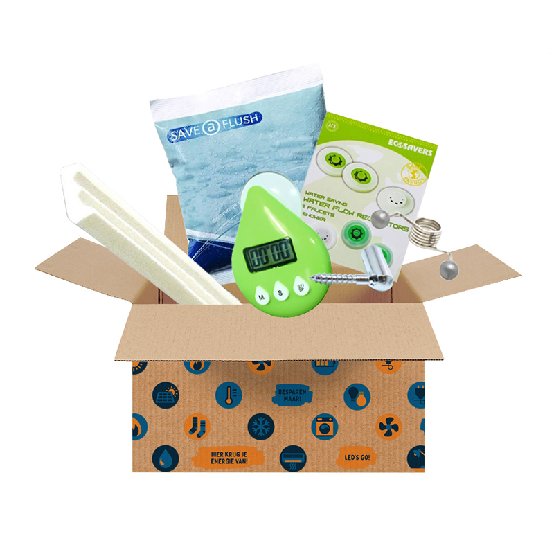Geef verspilling een koude douche met deze energiebespaarbox! De doos zit vol handige bespaarhulpjes: twee waterbespaarders, een wc-stortbak verkleiner, een deurdranger, een douchecoach en tochtband. Minder water door de afvoer en minder warmte naar buiten, dus meer euro’s in de zak. Bovendien maakt u uw collega's of relaties bewust van duurzaam leven. Daar krijgt u energie van!