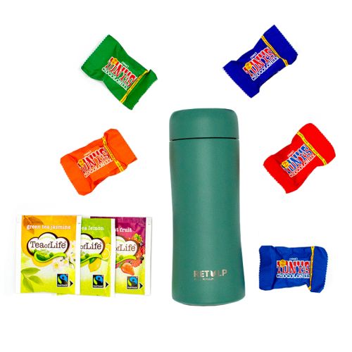 De fles kan worden bedrukt en gegraveerd. De thee, de Tiny Tony's en de Retulp fles worden samen verpakt in een doosje.