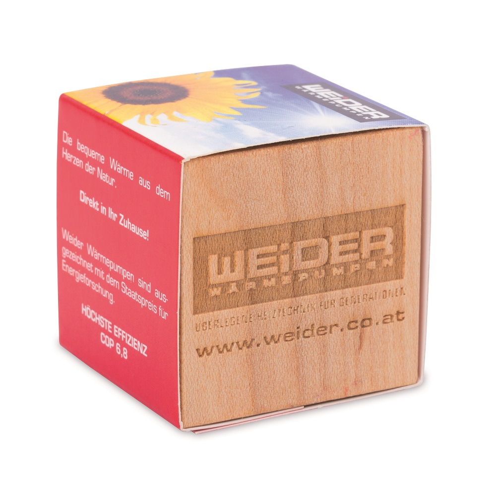 Op zoek naar een compact geschenk om te proosten op een bloeiende samenwerking? Dan is dit chique houten potje een uitstekend idee. Het potje wordt geleverd met een turftablet en zaden. De wikkel om het potje kan full colour worden bedrukt; geheel naar eigen wens. Ook is het mogelijk om het houten potje te graveren met uw logo of tekst.