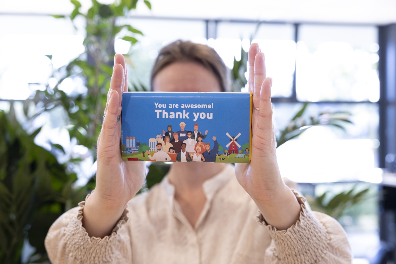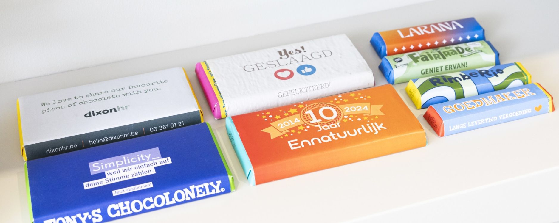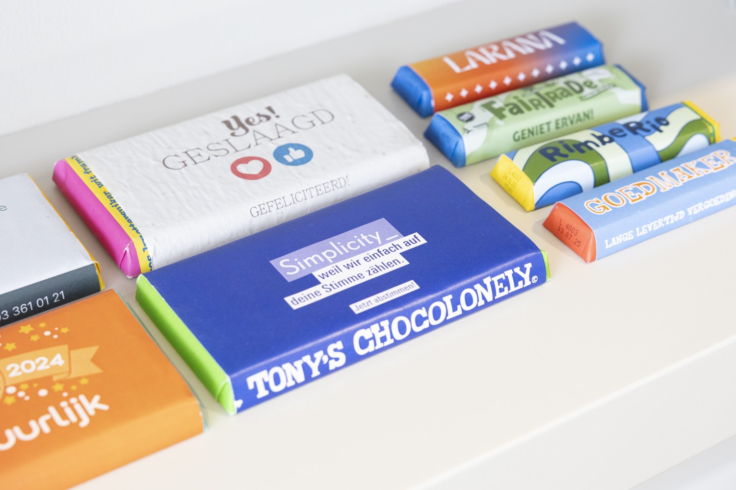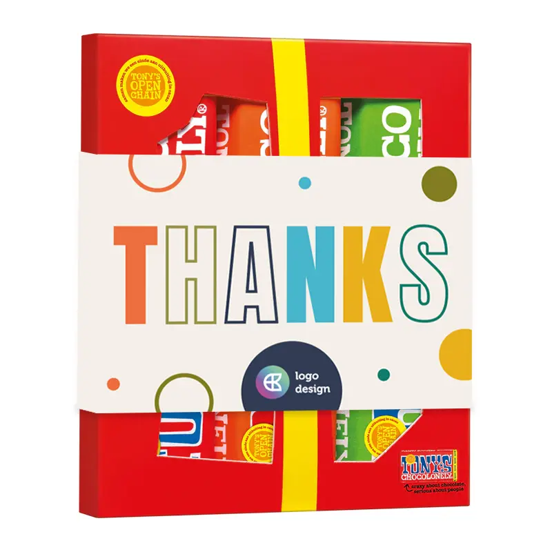 Chocola van Tony's Chocolonely is perfect als relatiegeschenk of bedankje voor uw medewerkers. Welke boodschap u ook wilt vertellen, met de gepersonaliseerde wikkel is alles mogelijk. Als u een bestelling heeft geplaatst, ontvangt u van ons een template. Deze kunt u dan helemaal naar wens ontwerpen. De wikkel wordt full colour bedrukt, dus uw boodschap valt zeker op.