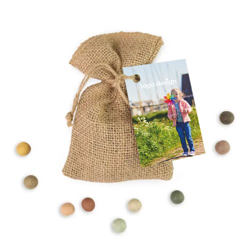Dit geschenkzakje is echt een leuke groene weggever! In het zakje zitten 5 gekleurde zaadbommen. De zaadbommen kunnen ergens op een stuk grond worden gegooid, en na een regenbui (of gieter) gaan ze ontkiemen en komen er fleurige bloemen uit. Ideaal voor bijen en vlinders, bevorderlijk voor de biodiversiteit.