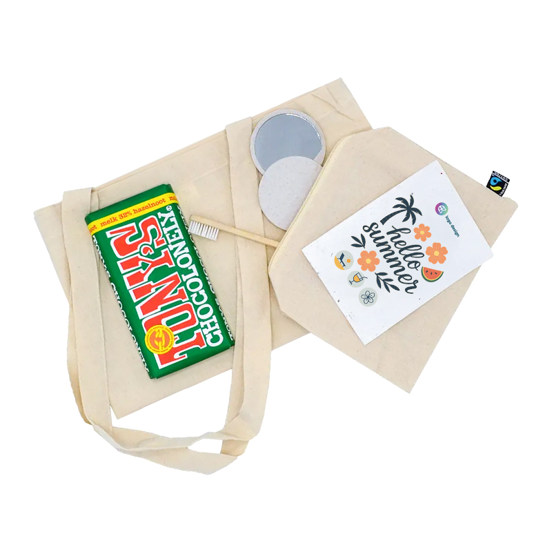 Uw relaties voorzien van leuke, duurzame reisproducten? Met dit pakketje zit u zeker goed! In het doosje zitten een Fairtrade katoenen tas, een Fairtrade toilettasje, een tandenborstel, een zakspiegeltje en een heerlijke Fairtrade chocoladereep van Tony's Chocolonely. Ook zit er groeipapierkaartje in de doos, waarop u uw eigen ontwerp kunt laten drukken. Ideaal om mensen een fijne vakantie of goede reis toe te wensen!